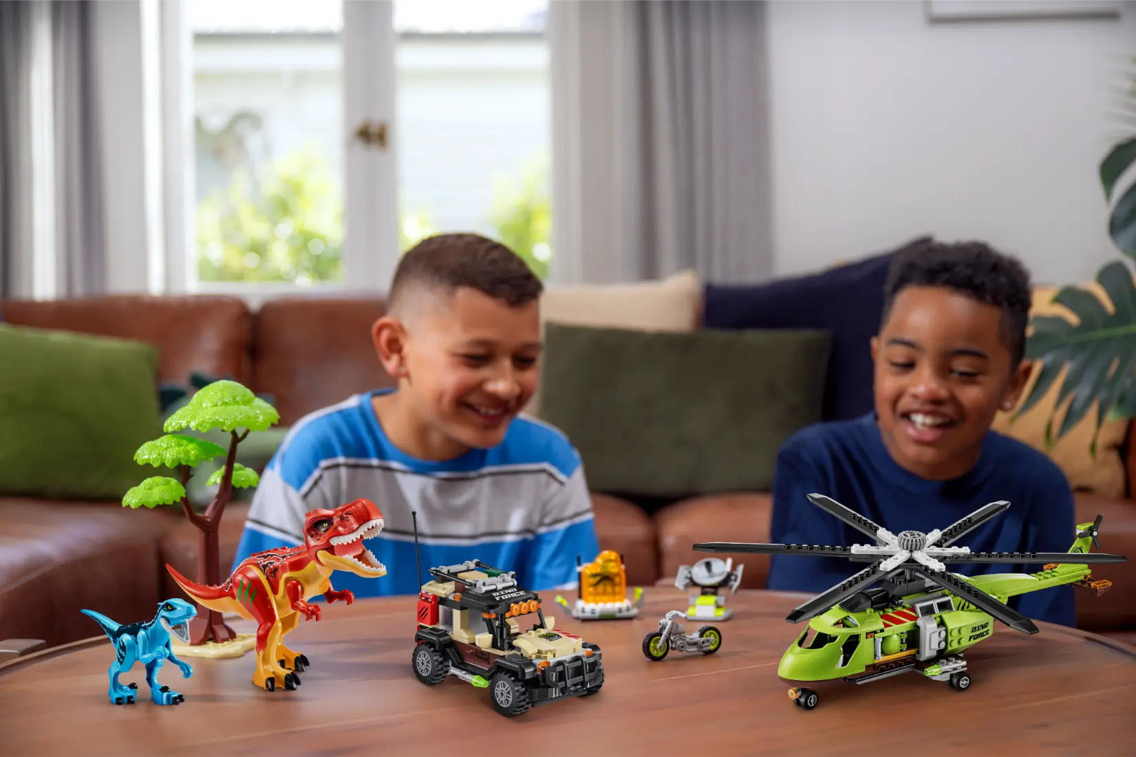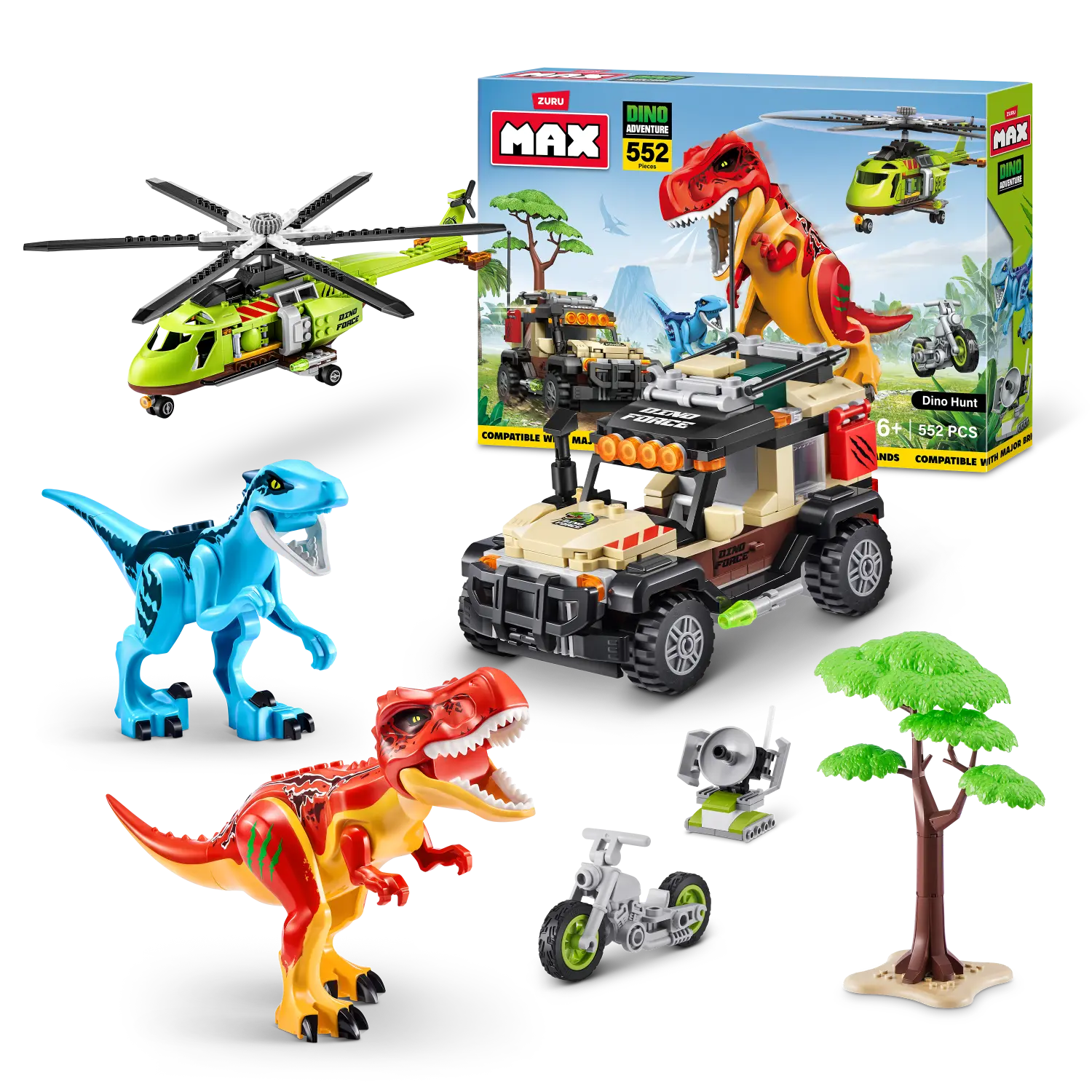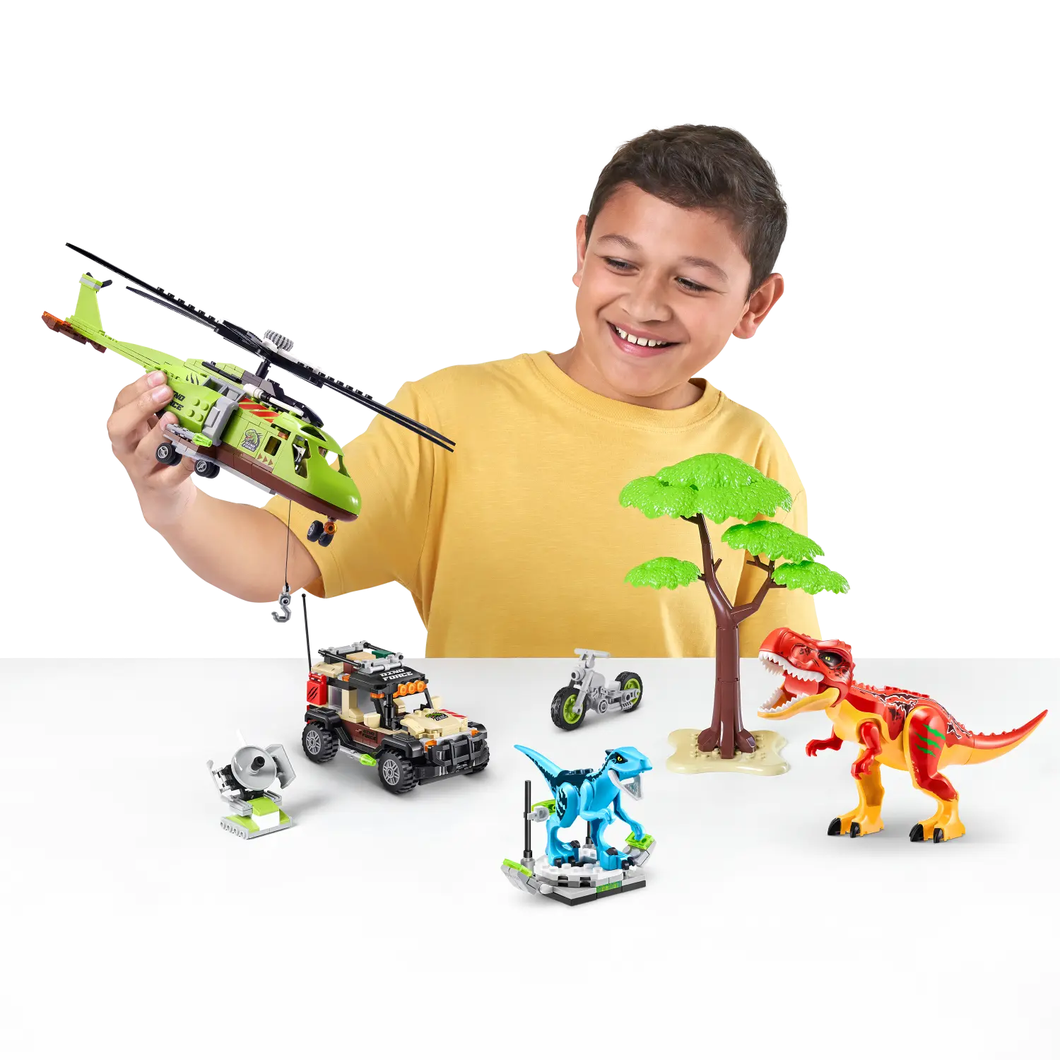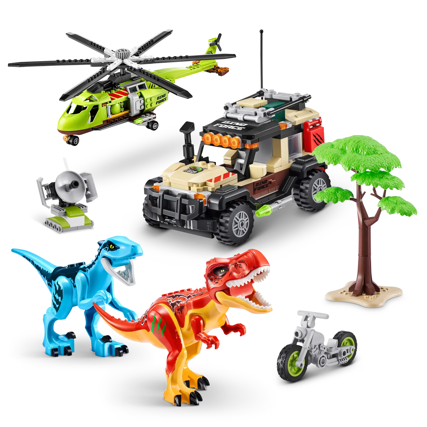 Armá el mundo prehistórico definitivo construyendo el helicóptero, el camión, la motocicleta, 2 dinosaurios, árboles y radares.