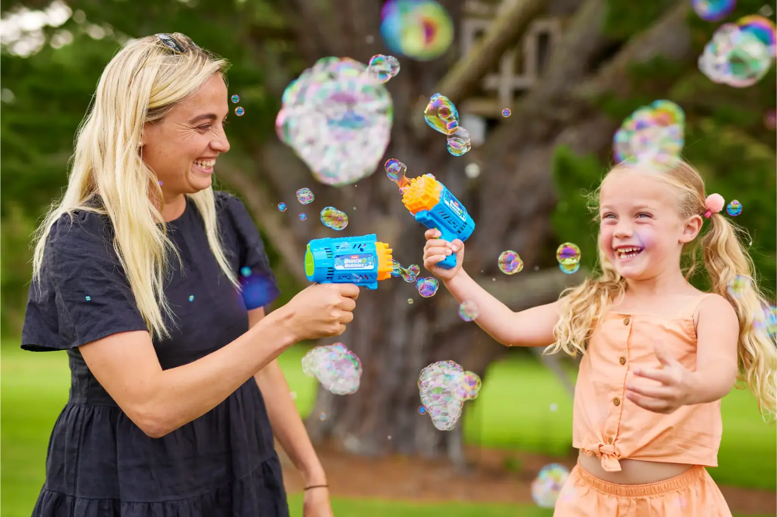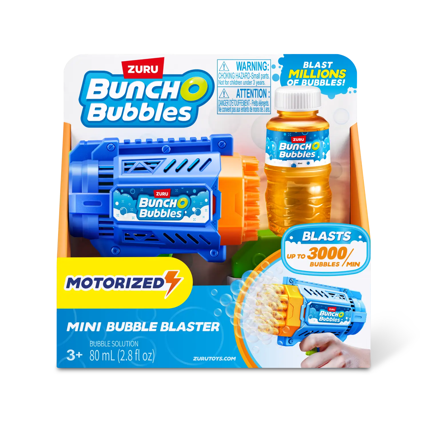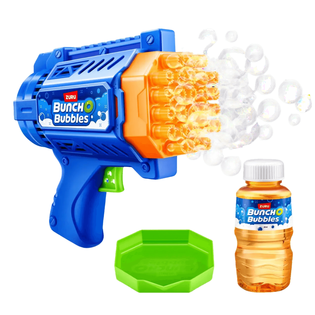 El blaster incluye 80 ml de solución para burbujas: solo verté la solución en la bandeja, sumergí el Bubble Blaster y empezá a lanzar hasta 3.000 burbujas por minuto.