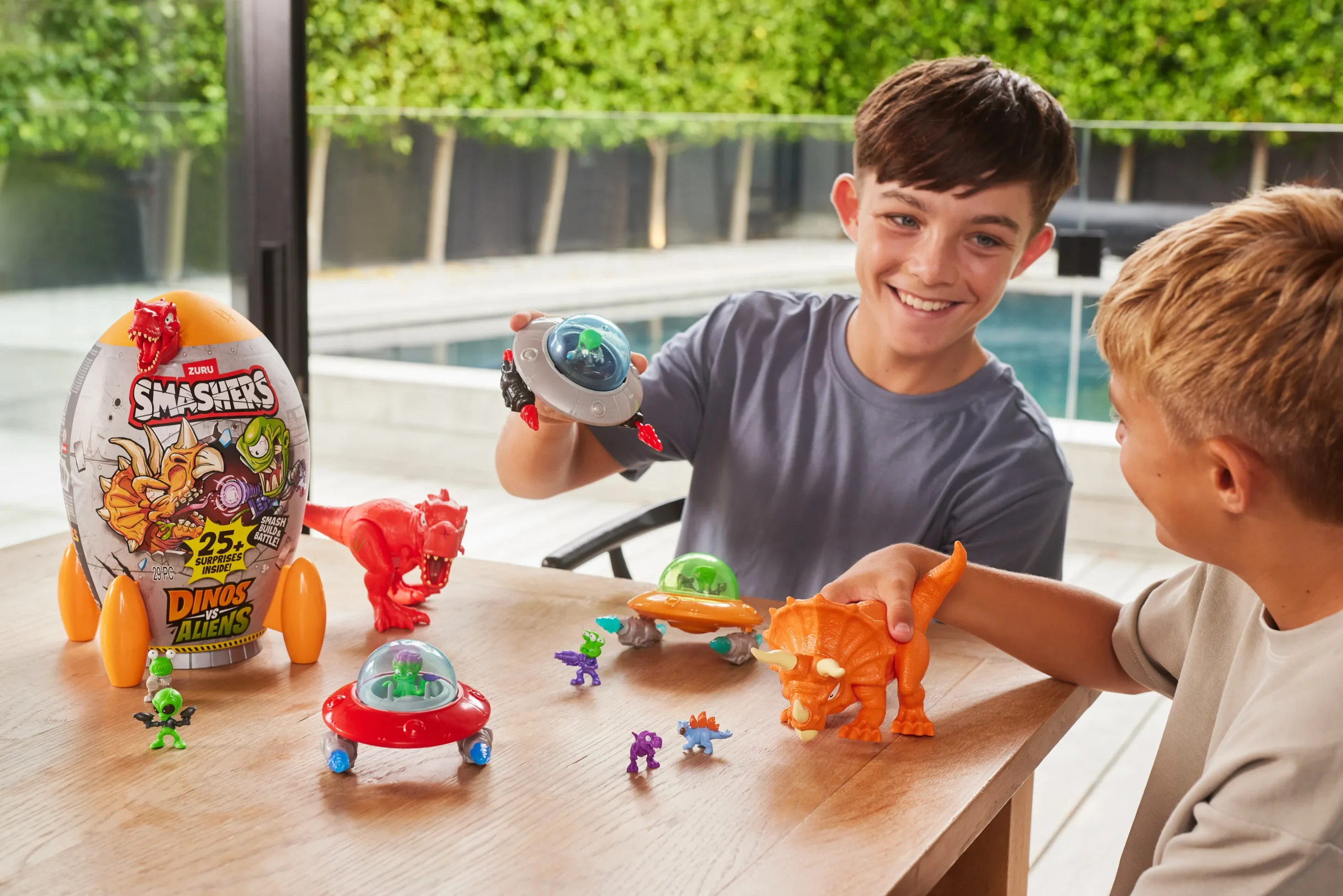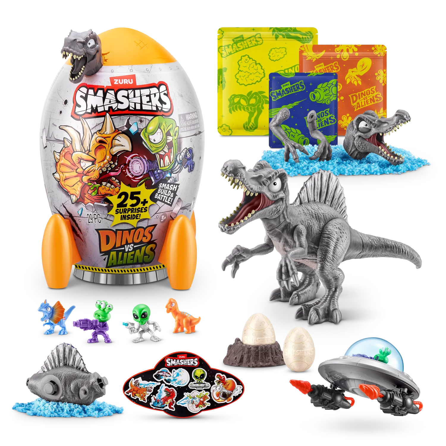 ¡Embárcate en una aventura épica con Smashers Dino VS Aliens! ROMPE EN PEDAZOS el cohete espacial y encontrarás piezas de dinosaurio escondidas entre la baba y la arena. Construye tu dinosaurio, lucha contra traviesos alienígenas y descubre más de 20 sorpresas. Consigue los tres dinosaurios para completar tu colección de Smashers.