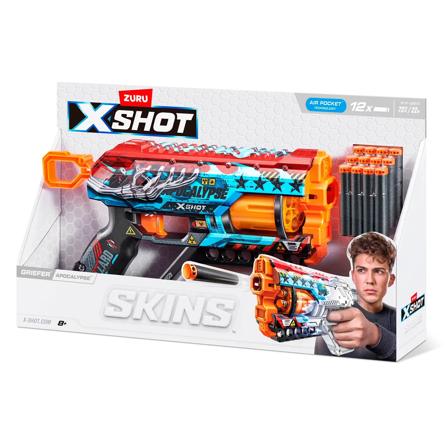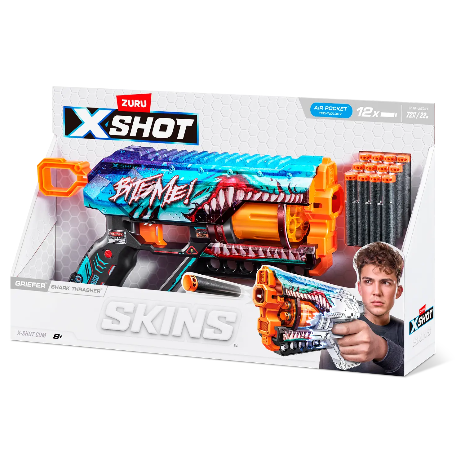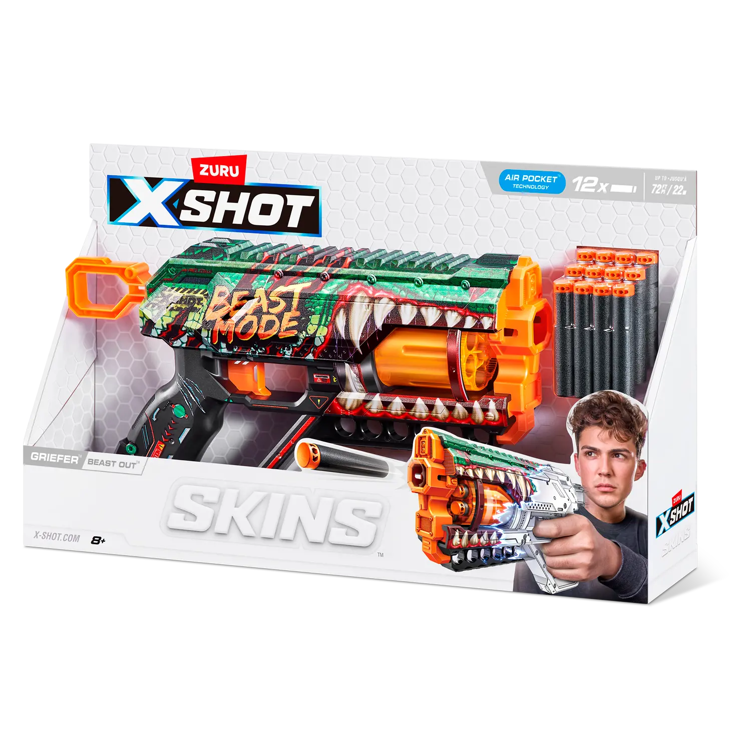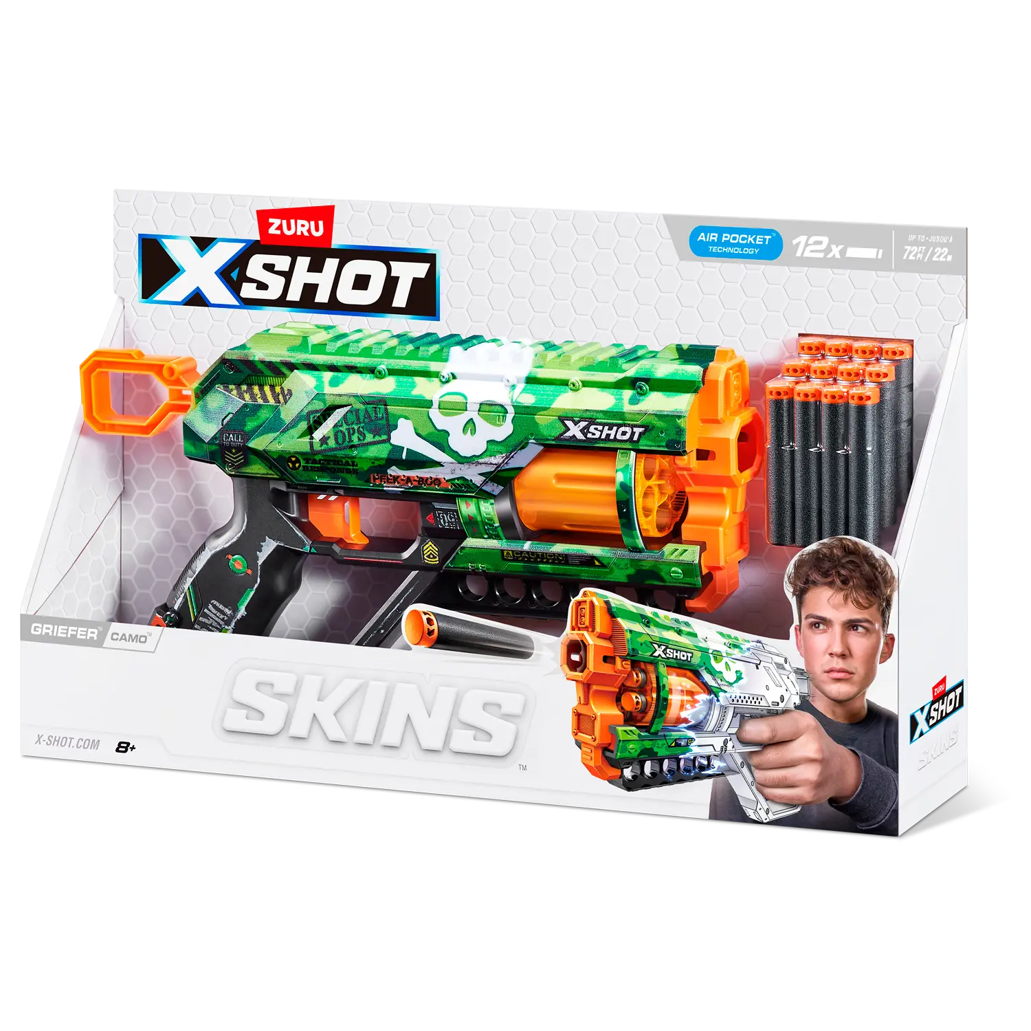 Las skins XSHOT hacen que la experiencia de juego de cambiar la skin de tu pistola sea real. Elige tu skin y únete a la batalla. La pistola XSHOT Skins Griefer tiene suficiente potencia para derribar blancos a una distancia de 27 metros/ 90 pies. Esta pistola derrota a todos en menos de 30 segundos con su cañón giratorio y su disparo rápido de 6 dardos. La pistola XSHOT Skins Griefer viene con 6 skins exclusivas para seleccionar y coleccionar y con 12 dardos de goma con tecnología air pocket. Elige diferente, elige la pistola XSHOT Skins.